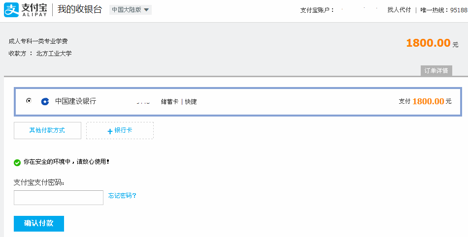 选择支付方式和支付银行,按照支付宝付款说明进行线上付款即可。