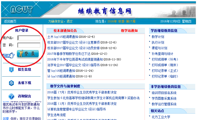 1、进入“继续教育信息网(http://jjxx.ncut.edu.cn/)”主页,输入用户名、密码(用户名为学号,初始密码为身份证号后6位),如下图所示:
