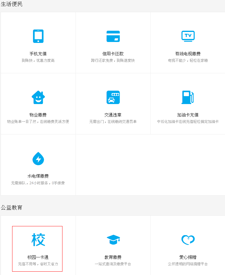 3、下拉页面,点击公益教育栏目下的【校园一卡通】