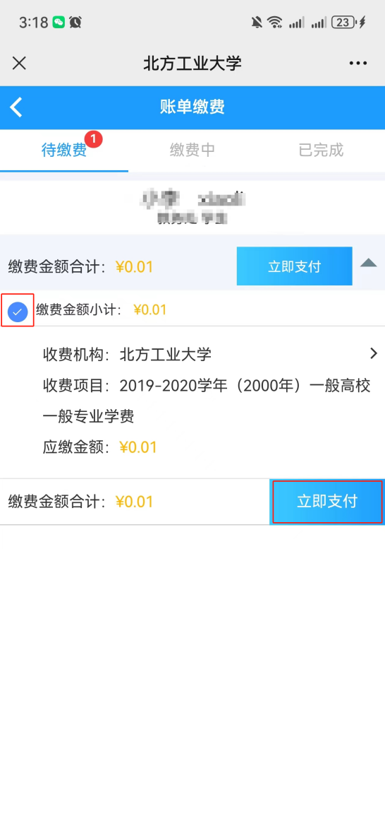 第四步:选中要缴费的项目,点击【立即支付】。