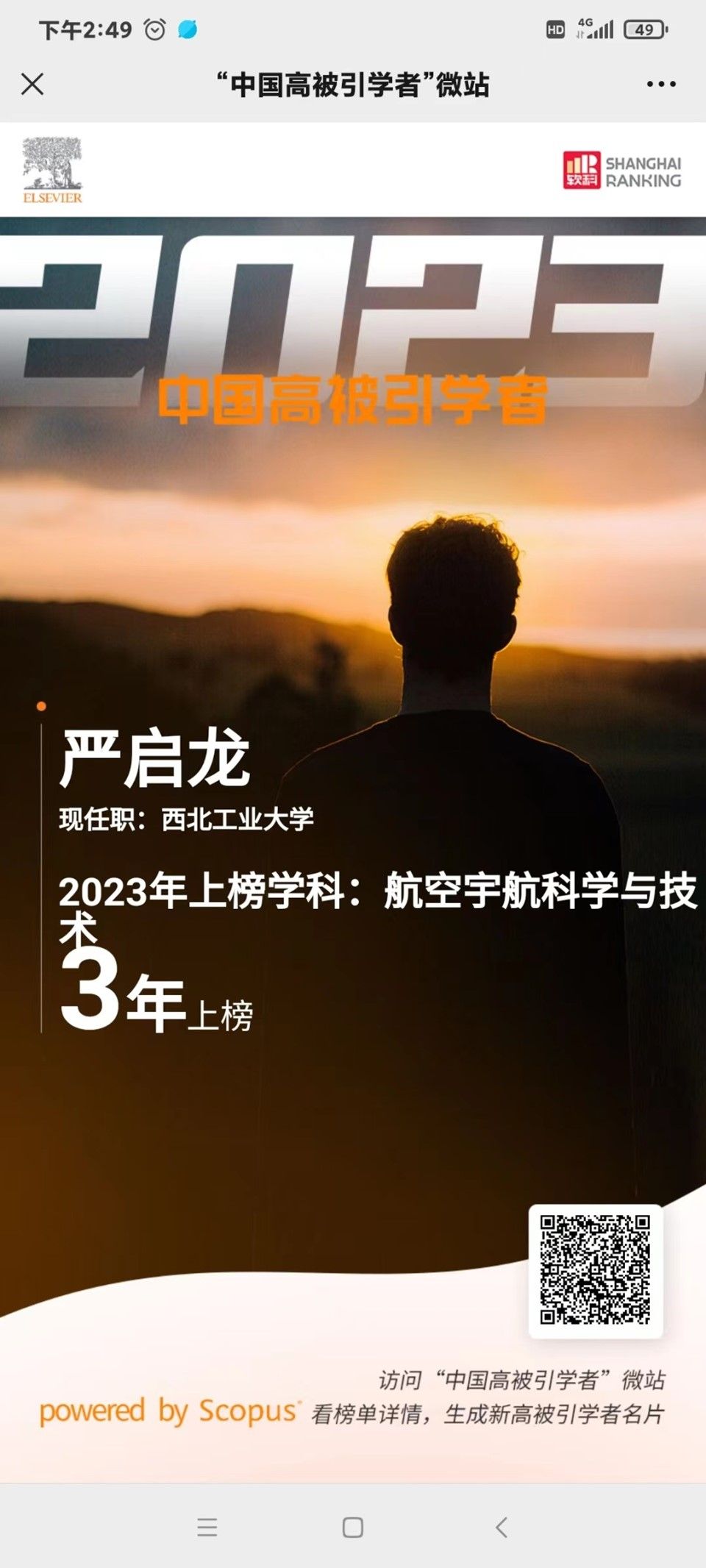 2024年3月27日,爱思唯尔 (Elsevier) 重磅发布2023“中国高被引学者” (Highly Cited Chinese Researchers) 榜单,kaiyun电子平台空天能源技术研究所2位教师上榜!