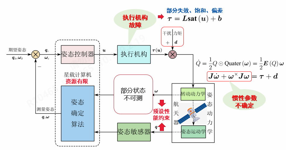 然而,作为服务对象的目标航天器通常是一些失效或非合作的卫星,这对服务航天器的空间操作和控制能力提出了极大的挑战。姿态控制系统作为航天器重要的分系统之一,其控制能力是否满足要求对在轨服务任务的成败有着举足轻重的影响。面对未来复杂的在轨服务任务,姿态控制系统极有可能存在着模型参数不确定、复杂未知干扰、角速度状态不可测、执行机构故障和复杂约束条件等典型特征,这对相应的姿态控制方案提出了更多的需求和更高的要求。因此,在综合考虑实际工程中存在的多种不确定性和工程约束的情况下,开展具有低复杂度和高性能特点的姿态控制方案对未来智能自主在轨服务具有重大的理论研究意义和工程应用价值。